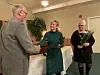Sigrid Bakka får prisen for årets bygningsvern for vølinga av eit gammalt eldhus på garden sin i Kvilldal. Her med LMT-leiar Magne Langeland og ordførar Gerd Helen Bø, som for anledninga spelar tause Birgitte.
