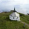 Dveberg kyrkje på Andøya frå 1843 er teikna av Christian Heinrich Grosch, same mann som har teikna Børsen i Oslo. Den åttekanta kyrkja er eit landemerke for både veg- og sjøfarande.Foto frå boka: Trond J. Hansen