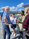 Reiseleiar Anders Lien (t.v.) frå Trøndelag i snakkar med Jorunn Hoås og Bonolo Ramphomane-Aandahl (t.h.) på torget på Sand. Lien har med seg ei gruppe på over 40 frå Oppdal.