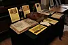 Olav Skjellevik har med seg desse fire kongebiblar til Suldal i kveld. Publikum frå lov å sjå, men ikkje røra. Han fortel at han har med seg ein faksimile-bibel av den eldste kongebibelen frå 1550, og den kan skodelystne få bla i. Foto: Olav Skjellevik