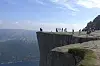 Turgåarar på kanten av Preikestolen. Fleire hundre tusen turistar tar kvart år turen opp til fjellplatået på nordsida av Lysefjorden i Forsand kommune i Rogaland.Foto: Marianne Løvland / NTB / NPK