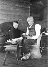 Svein Hovden lagar tresko medan barnebarnet Svein ser på. Barnebarnet var distriktslege i Valle i fleire tiår på slutten av 1900-talet.