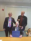 Frå venstre: Assisterande distriktsguvernør Bjørn Rismyr, Årstein Bustad og president i Suldal Rotary Klubb, Martijn Bellemakers.