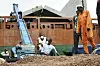 Ein eim av sjokolade heng over hamnearbeidarane som sender sekk på sekk med kakaobønner opp i digre tankskip. 40 prosent av all kakao i verda kjem frå Elfenbeinskysten. Foto: Bibiana Dahle Piene / NTB / NPK