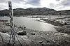 Trass mykje regn, har vassmagasina framleis mindre vatn enn vanleg på denne tida. Her frå førre gong det var så låg vasstand i Norge, i 2006. Det er så lite vatn at målestaven står på tørr grunn ved vassmagasinet Osvatnet i Torbudalen ved Sunndalsøra. Foto: Gorm Kallestad / NTB / NPK
