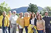 Svanhild Løge Skålheim (nummer fem frå venstre) og Marita Husevåg Hellesen (t.h) her med fylkes- og stortingspolitikarar frå Rogaland, ønskte velkommen til Erfjord skule.