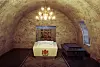 Kong Haakon og dronning Maud kviler i marmorsarkofagen i det kongelege mausoleet. Til høgre ligg kong Olav og kronprinsesse Märtha i bronse-sarkofag under Slottskyrkja på Akershus festning. Krypten.Foto: Morten Hvaal / NTB / NPK