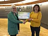 Kraftverksjef Agnes Oppistov Lykkebø overrekkjer ein gåvesjekk på 50 000 kroner til innsamlingsaksjonen i Suldal ved ordførar Gerd Helen Bø. Foto: Hydro Energi