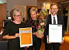 Butikksjef Hanne Karin Natland (i midten) tok imot butikkprisen av seniorrådgivar Per Kjetil Jørgensen i Merkur-programmet. T.v. Helena Hauge som er nestkommanderande ved Coop Marked Vadla. Foto: Merkur-programmet