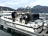 Kjetil, Jonathan, Henrik, Mathilde og Lene Tønnesen rett før dei fann fram sparkesyklane frå båten og sette kursen mot Suldal Bad.