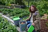 Astrid Guggedal viser ein full bokashi-bøtte klar til å bli tømt. To bøtter meiner ho er passe til ein hushaldning på to. – Har du for lite matavfall, kan du jo ta med kaffi-grut og andre matrestar frå jobben din, rår ho.