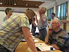 Magne Langeland (Sp), sitjande fremst i biletet snudde i siste liten og sikra fleirtal for Suldal bad. Her i samtale med Eskil Nerheim (V). Bak Kari Vaage Gjuvsland (Ap) og Ola Jelsa (Sp), Endre Kvæstad (Sp).