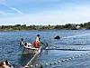 Bilde frå kilenotfisket på Hebnes i 2019. Her ser ein korleis nota ser ut, der laksen blir tvungen til å svømma inn i trongare og trongare kilar slik at den ikkje kjem seg ut igjen. Trekanten fremst i nota, nærast i bildet, kallast fiskerommet.