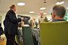 Stolar til skulen blei opphavet til den varmaste debatten under kommunestyrets møte i går kveld. Ståande med ryggen til er Sverre Underbakke (H), sitjande f.v. Tone Mari Sand (SV), Tormod Skeie (SV), Jarle Haugsland (KrF). På andre sida av bordet står Gerd Helen Bø og Magne Langeland, begge frå Sp.