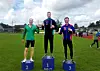 Torleiv Hølland (i midten) vann to gull under helgas Norgesmeisterskap i friidrett for veteranar: Gull på 100 meter og 200 meter i klassen menn 45-49. Foto: Kjell Vidar Norheim