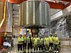 Den 450 tonn tunge rotoren til ein av generatorane i Kvilldal heng i to traverskranar som er kopla saman. Den blir løfta ut og plassert i ei montasjegruva, medan ein vedlikeheld statoren i generatoren. Frå venstre: Rune Jønsson, Kolbein Moe, Knut Solberg, Heine Mo Willig, Pål Bech Lind, Åsmund Bakka, kranførar Kristian Slagstad (grøn hjelm), Per Arne Roalkvam Tytlandsvik og Stian Engeskar.
