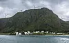 Ei samanlikning av spørjeundersøkingar frå 2024 og 2025 viser at færre nordmenn nå er positive til vindturbinar i eigen kommune. Her ser me vindturbinar tilhøyrande Haram vindkraftverk på fjellet over Ulla på Haramsøya i Ålesund kommune i Møre og Romsdal. Foto: Halvard Alvik / NTB / NPK