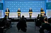 Assisterande helsedirektør Espen Rostrup Nakstad, helse- og omsorgsminister Ingvild Kjerkol, statsminister Jonas Gahr Støre og FHI-direktør Camilla Stoltenberg under pressekonferansen om koronasituasjonen i Norge fredag. Foto: Torstein Bøe / NTB / NPK