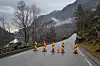 Riksveg 13 har vore stengt sidan i natt, men opnar nå rett over klokka 13. Vegvesenet skal reinska i fjellsida utover dagen, og vegen kan bli stengt i kortare periodar i dag. Foto: Ole Jørgen Nøstbakken.