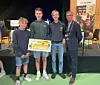 Jakob Nessa, Amund Hiim Havrevoll og Noah Parelius Moe Lindseth, her med fungerande ordførar Torbjørn Indrebø, kan reisa heim til Suldal i dag med ein flott 3. plass i jubileumsutgåva av den store Ryfylke-quizen.