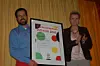 Nicholas Guindani og Ryfylke Mat er årets vinnar av merkevareprisen i Ryfylke. Styreleiar i Ryfylkeallliansen Marianne Sørskaar Torbjørnsen overleverer diplom, heider og ære. Foto: Ryfylkealliansen.