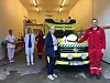 Den er ikkje så stor, desinfeksjonsroboten som står på panseret på ambulansen, men den er til stor nytte i smittevernarbeidet. Frå venstre smittevernsjukepleiar Vigdis Førland, smittevernlege Stine Daldorff, ambulansearbeidar Maiken Søreng, Astrid Rørvig, leiar i Sand sanitetsforening, ambulansearbeidar Knut Helland og smittevernsjukepleiar Astrid Gundersen.