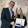 Silje Haugsland får gullklokka av Claus Haals i NHO for beste resultat av dei 32 speditørene som tok Speditørskolen i fjor. Foto: NHO Logistikk og Transport.