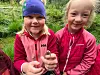Thea Tjøstheim (t.v) som startar i andre klasse til hausten, saman med Mathea Nilsen som skal starta i tredje. Dei var glade for å finna padde på sommarleir.