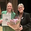 Karen Hiim Benninghoff kunne glad motta sin eigenproduserte diplom. Her i lag med leiar i Suldal Mållag, Randi Ese Ur under mållaget sin nyttårsfest.