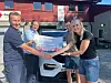 Glade givarar og glade mottakarar ved Røde Kors-huset på Garaneset i dag. F.v. Stig Morten Nerheim og Hans Olav Brustveit frå Sparebanken Vest og på hi sida takkar Kari Steine og Kjetil Åsland Nevøy, høvesvis leiar og operativ leiar i Suldal Røde Kors.