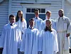 Frå venstre bak, står Annike Haugsland, Johan Kilane, Borg Laugaland Fuglestein og prest Toralf Ladstein. Framme, frå venstre, Andreas Nese, Kristian Lovra og Vilde Leirvik.