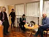 Diakon Torborg Fossan Steine kjem nøgd ut frå kontoret og kan fortelja at nå hadde ho akkurat tatt imot endå ei påmelding til gudsteneste. Frå venstre Turid Skjelstad, Torborg Fossan Steine, Margit Haver og Anne Marit Øvstebø.