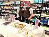 Leiar for Vinmonopolet på Sand, Siri Gauthun (til venstre) og Kari Grunnerås Saltvik feirer 100-årsjubileumet med kaker og bobler til kundane.