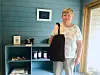 Mette Kvæstad med eitt av handlenetta ho har sydd. I bakgrunnen ser du fleire av produkta til Stolt.